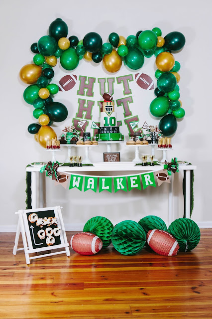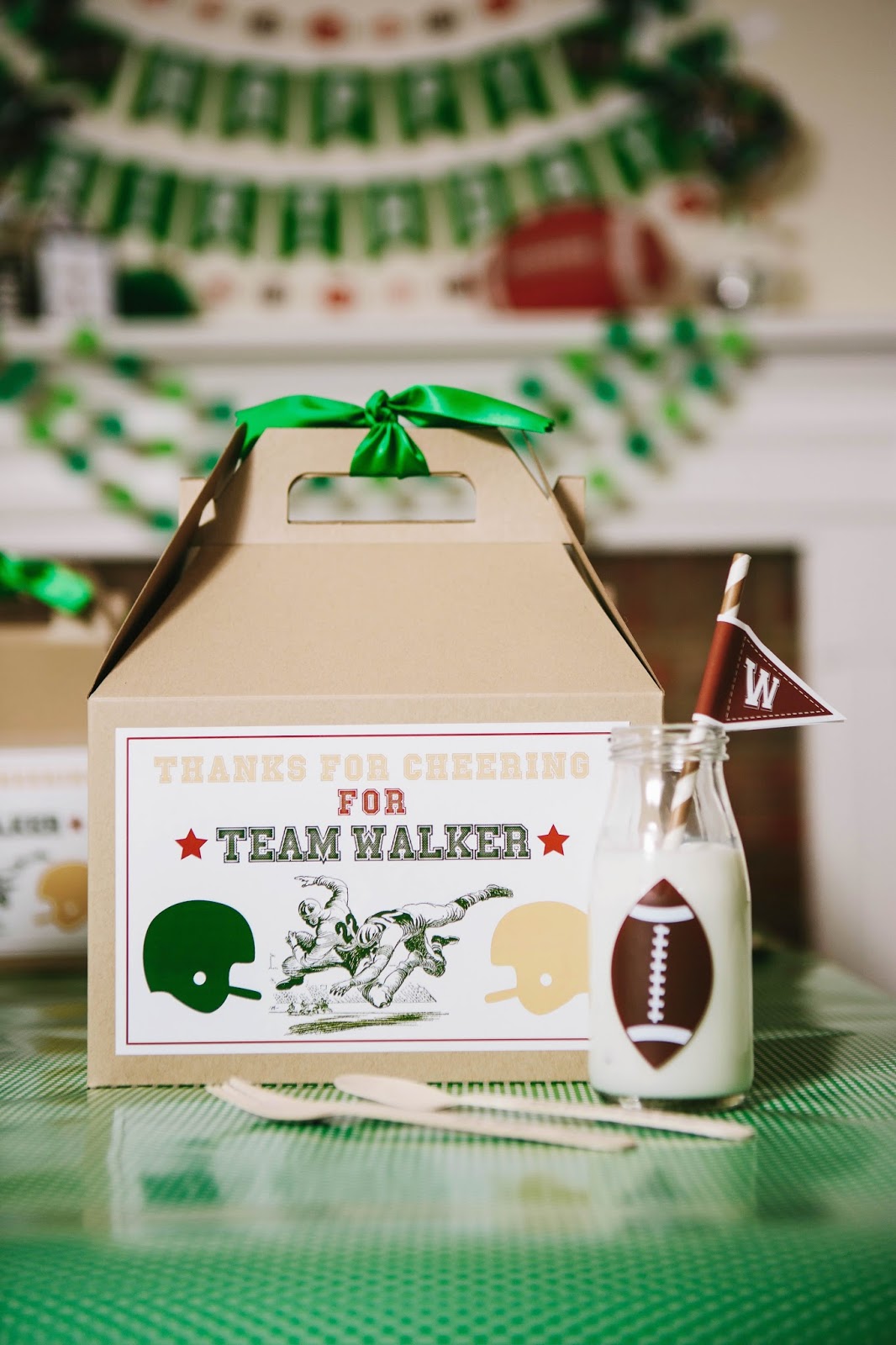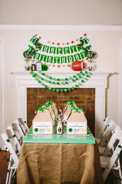 This year's theme was Walker's Vintage Football party. Lots of greens, browns, and golds set the vintage tone. Starting with the invite "tickets" and ending with super cute take home goodies in gable boxes. Here are some pics from the party!