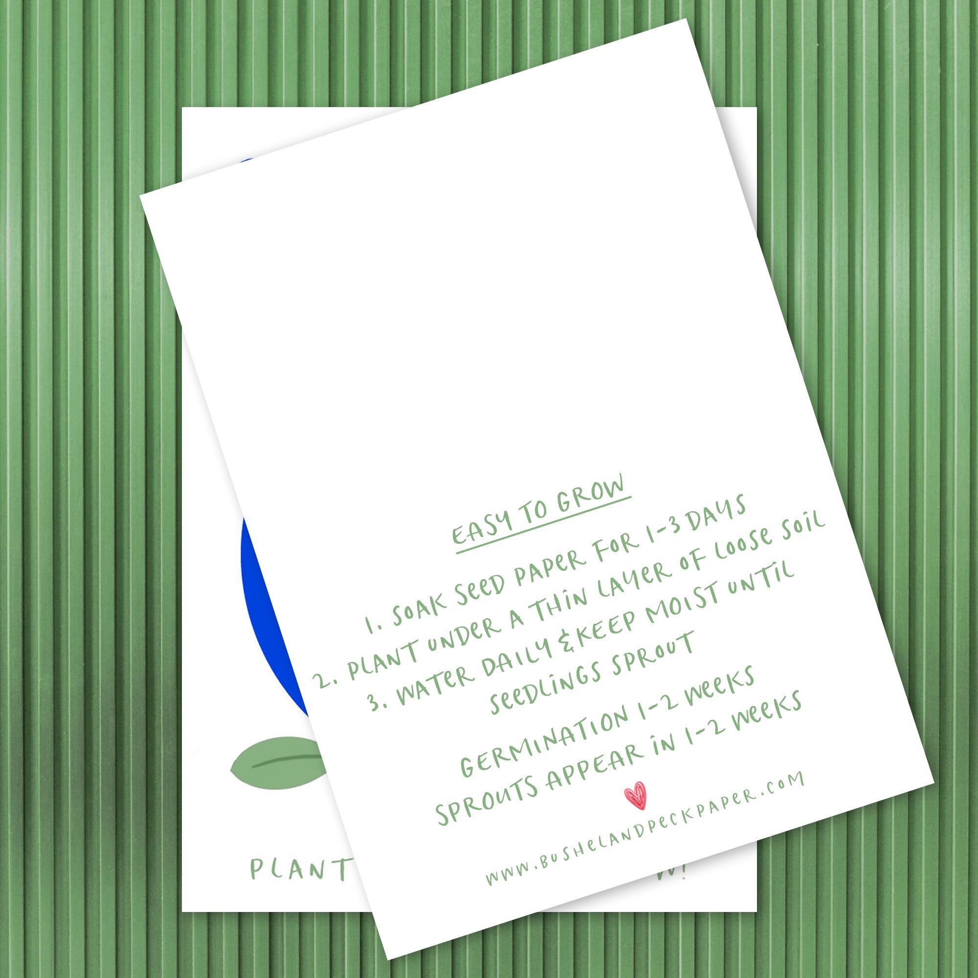 Simply soak the seed paper in a bowl of water for 1-3 days, then plant under a thin layer of loose soil. Water daily and keep moist until seedlings are well established. Germination time is 1-2 weeks. Sprouts will appear in about 2-3 weeks.